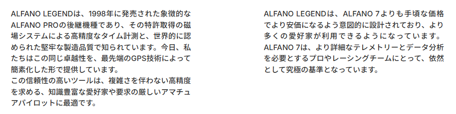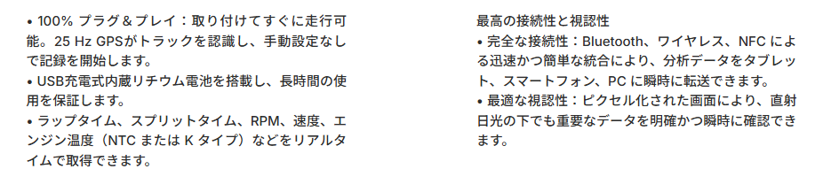![]() ![]() 本機には Bluetooth、25Hz GPS、ワイヤレス、NFC を搭載し、 1系統の温度センサー(NTCまたはK) の計測が可能です。 もちろん、エントリーモデルとしての位置づけを明確にし、 Alfano 7 との差別化を図るため、以下の制限があります。