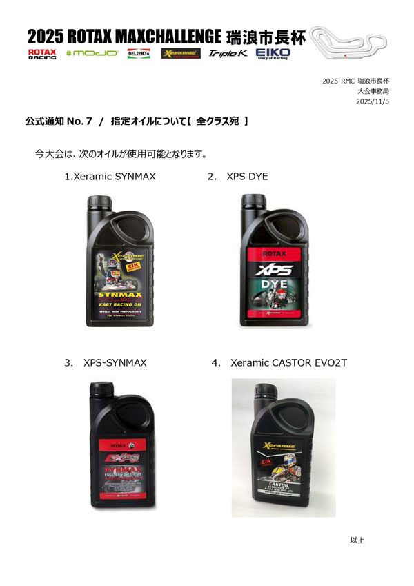 今回の出来事から、今後の対策と致しまして、車検のあり方、測定特殊工具を主催者への配布、事前に確認チェック出来るよう、ROTAX社への品質徹底、改善を要求致します。